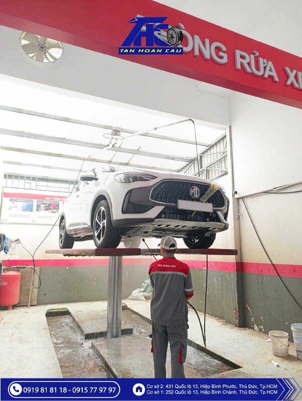 👉 Tại Ô Tô Tân Hoàn Cầu, quá trình rửa gầm được thực hiện trên cầu nâng, kết hợp xịt áp lực + hóa chất tẩy rửa chuyên dụng giúp làm sạch sâu mà không làm hư hại chi tiết máy.