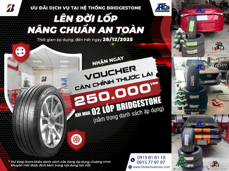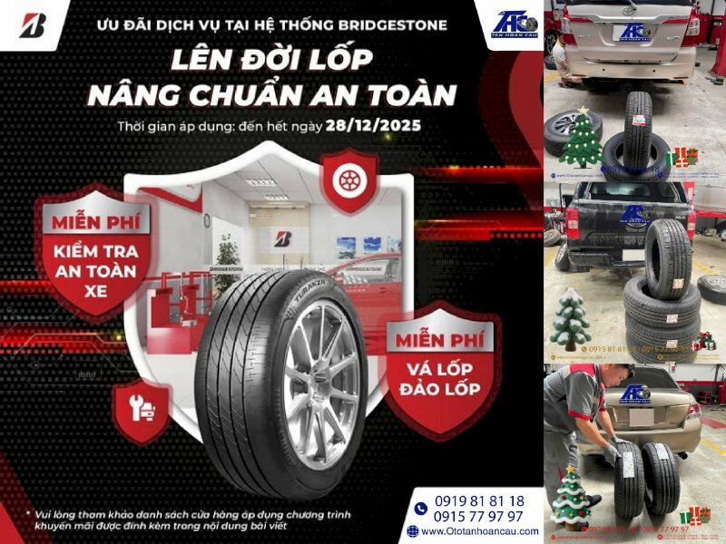 Bridgestone Việt Nam phối hợp cùng hệ thống Trung Tâm Dịch Vụ Ô Tô Tân Hoàn Cầu TPHCM, mang đến cho bạn trải nghiệm kiểm tra an toàn - hoàn toàn "MIỄN PHÍ" và "ƯU ĐÃI CỰC CHẤT" dịp cuối năm!