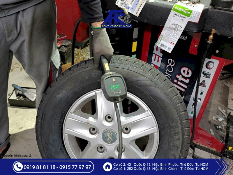 Đo lượng hơi bơm vào lốp xe bằng đồng hồ đo áp suất lốp xe cầm tay tại Ô tô Tân Hoàn Cầu
