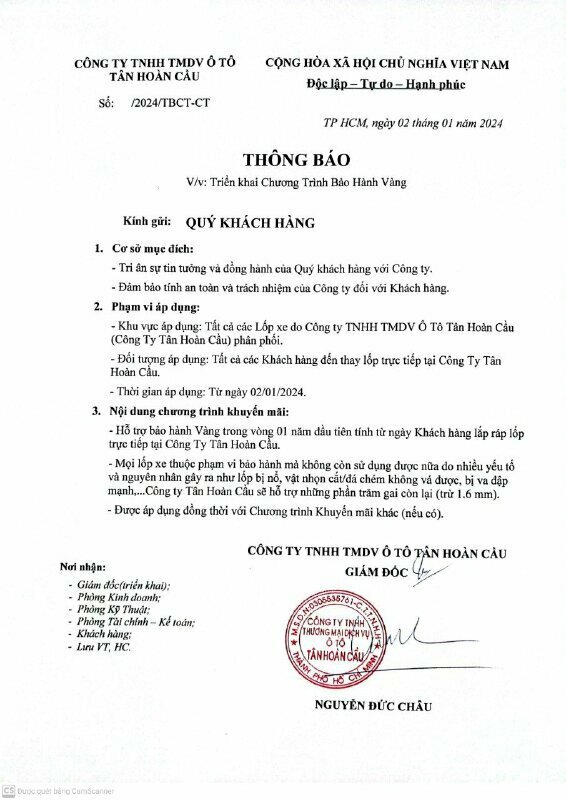 Thông báo “Bảo hành Vàng 1 năm” tại Công ty ô tô Tân Hoàn Cầu