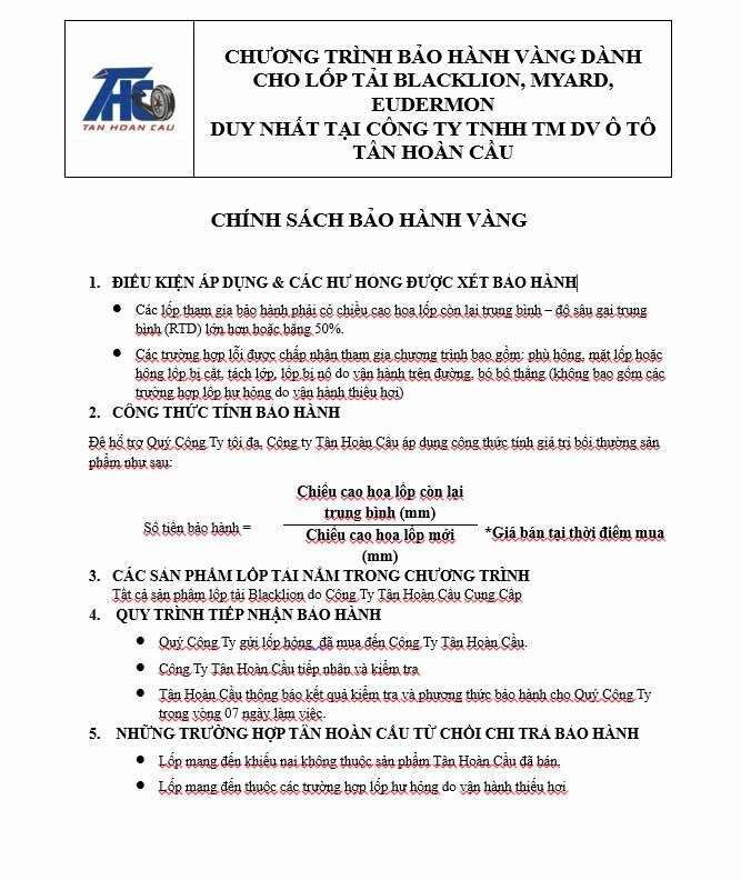 - "Bảo Hành Vàng" tại Công ty Tân Hoàn Cầu: Đây là chính sách bảo hành đặc biệt dành cho Khách hàng thay lốp trực tiếp tại Công Ty Tân Hoàn Cầu. Dịch vụ nhanh chóng, hỗ trợ khách hàng một cách tận tâm và chu đáo.